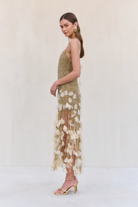 A breathtaking beaded gown with silk organza flower petal details. — Midi length — Objet d'art — All over beading — Silk organza flower petals — Side zipper