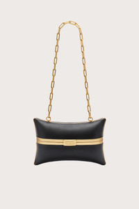 A black leather clutch resembling a puffed pillow with a removable chain strap. — Black leather — Front closure — Gold-toned hardware — Removable chain strap — Can fit an iPhone SIZE & FIT NOTES 2.75" W x 5.12" H x 8.46" L COMPOSITION AND CARE 100% SHEEP LEATHER; LINING:51% RECYCLE POLYESTER, 49% POLYESTER; HW: 100% ZINC ALLOY Wipe with a soft cloth to remove dust. Use a leather cleaner for deep cleaning. Apply leather protector spray to prevent water and stains.