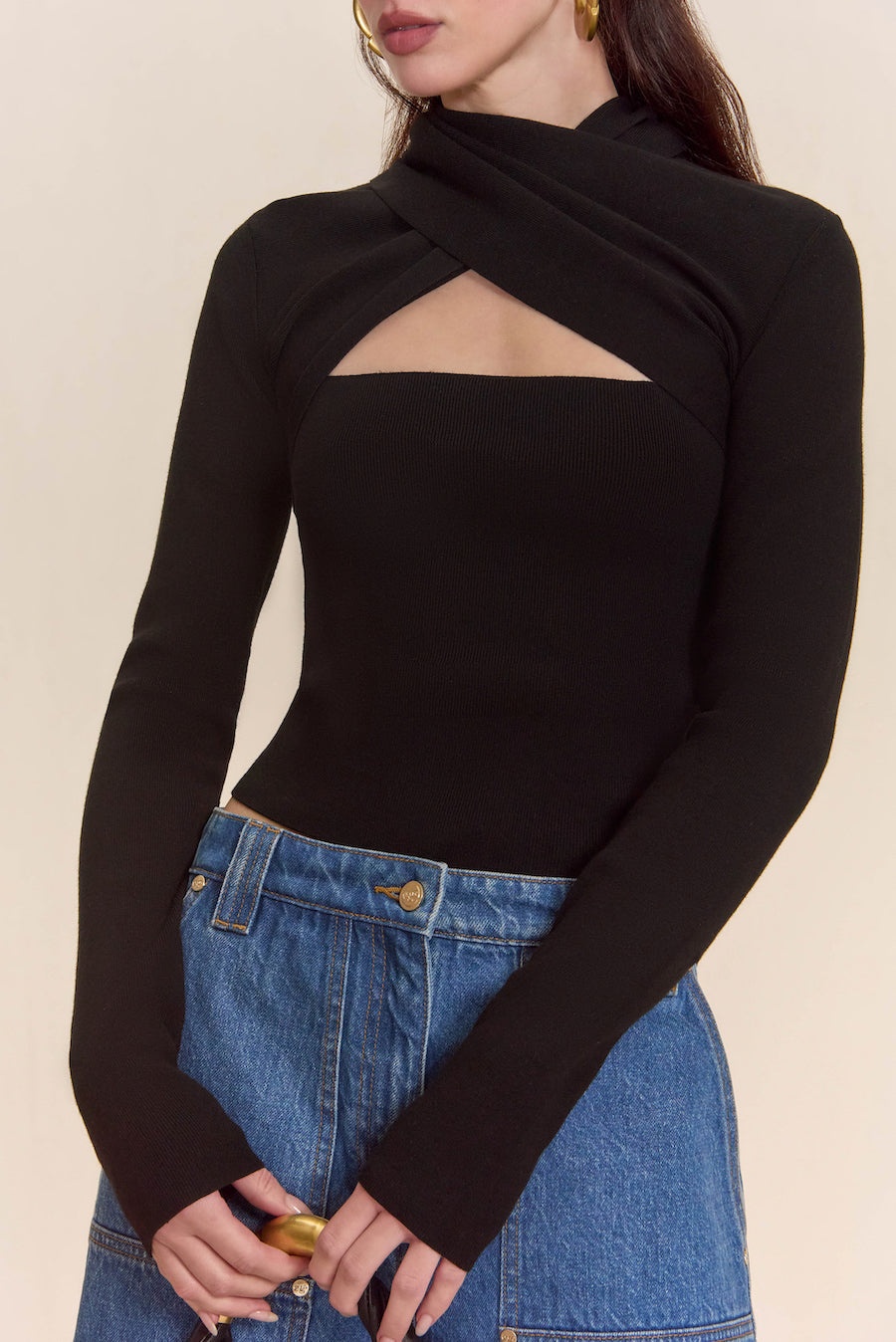 A high neck shrug cardigan that was designed to be worn with our knit dresses to creating the perfect elevated set. — Sponge knit yarn — High neck shrug silhouette — Wrap detailing in front — Wear with the Crawford Top COMPOSITION AND CARE 79% VISCOSE 21% NYLON