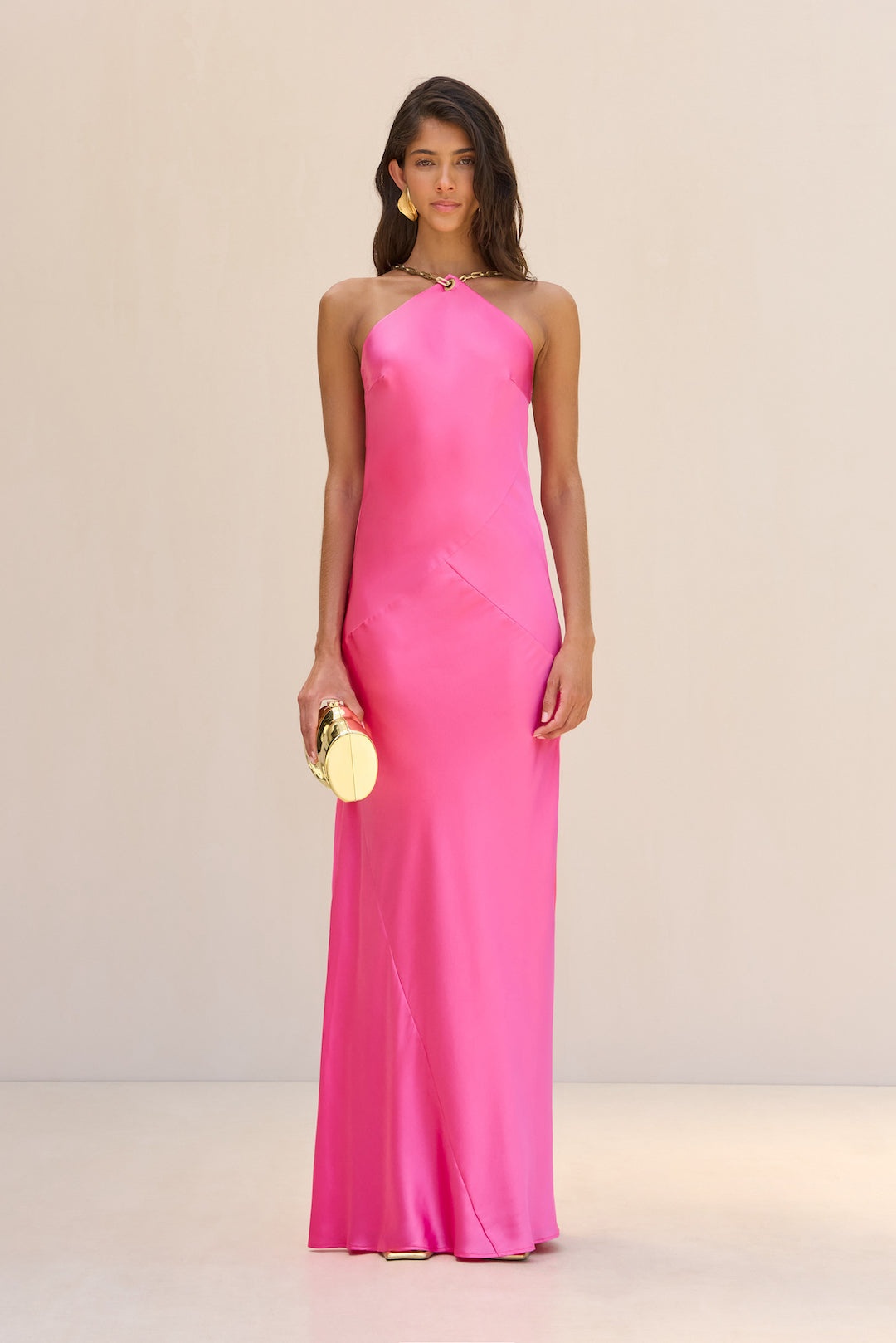 A floor-length, bias-cut halter gown with a gold, chain adorned neckline that connects to the open back as straps. — Halter neckline — Gold chain-link hardware — Open back — Floor length SIZE & FIT NOTES Model is 5'11" and is wearing a size Small COMPOSITION AND CARE 79% NAIA ACETATE 21% POLYESTER