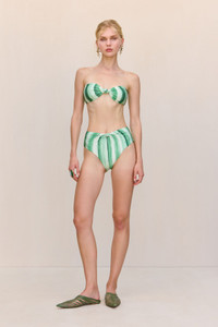 A bandeau bikini top with a knot detail at the bust. — Bandeau — Removable padding — Shimmer tricot fabric — Double lined — Wear with Oswin Bikini Bottom SIZE & FIT NOTES Model is 5'10" and wearing a size S COMPOSITION AND CARE 80% POLYAMIDE 20% ELASTANE
