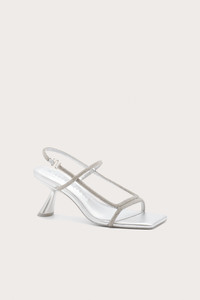 An open-toe sandal designed with a comma shaped heel and rhinestone straps. — Comma shaped heel — Silver hardware — Square open-toe — 2.76" heel height SIZE & FIT NOTES 70MM HEEL HEIGHT COMPOSITION AND CARE UPPER: 100% SHEEP LEATHER, TRIM: 100% PLASTIC, OUTSOLE: 100% LEATHER, HEEL: 100% ABS Keep rhinestone straps sparkling by dusting gently with a soft brush and spot-cleaning with water or mild soap. Avoid sun, rain, and rough surfaces, and always handle sandals by the sole, not the straps.