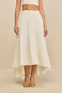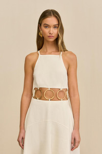 An eye catching midi dress featuring a waist cutout held together by circular gold rings. — High low hem — Adjustable straps — Gold toned hardware — Center cutout SIZE & FIT NOTES Model is 5'10" and wearing a size Small COMPOSITION AND CARE 38% LINEN 25% WOOL 20% RAMIE 17% SILK