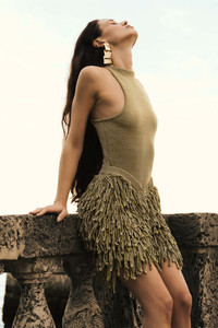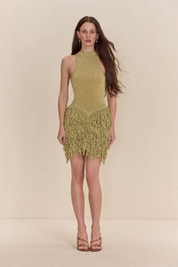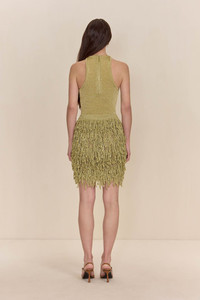 Preorder - Estimated Ship Date is Between February 22nd and March 8th A statement mini skirt with a plunging waistline and all over gold knit fringe. — Mini length — Metallic gold yarn fringe — Plunging waistline detail — Wear with the Cassius Bodysuit COMPOSITION AND CARE 60% VISCOSE 40% POLYETHYLENE TEREPHTHALATE