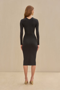 A long-sleeve update to our best-selling Cristos Dress, this is a midi-length knit dress with gold-toned chain-link hardware, high neck, and central cutout. — Texture, gold-tone brass chain — Gathered at center front — Straight fit skirt SIZE & FIT NOTES Model is 5'11" and is wearing a size Small Runs small — If between sizes, we recommend sizing up COMPOSITION AND CARE 65% VISCOSE 35% NYLON