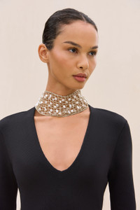 A long sleeve knit midi dress with a woven neck strap that connects to a pearl adorned bow detail that accentuates an open back. — Midi length — Long sleeve — Pearl adorned neck strap — Open back with bow details FIT NOTES Model is 5'10" and is wearing a size Small COMPOSTION AND CARE 60% VISCOSE 40% NYLON