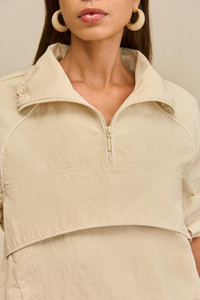 An effortless nylon funnel neck jacket with an adjustable drawstring waistband. — Nylon — Drawstring neck and waist — Quarter zip — Wear as a set with the Tebie Pant SIZE & FIT NOTES Model is 5'10" and wearing a size Small COMPOSITION AND CARE 100% NYLON