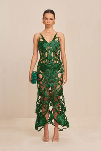 An organic gown with hand-embroidered jewel-toned crystal baguette beads forming various, symmetrical cutouts throughout the dress.- Hand-embroidered crystal baguette beads- Numerous symmetrical cutouts- Ankle-length- Irregular hem SIZE & FIT NOTES Model is 5'9" and is wearing a size Small COMPOSITION AND CARE Base: 100% Silk Embroidery: 100% Glass Beads