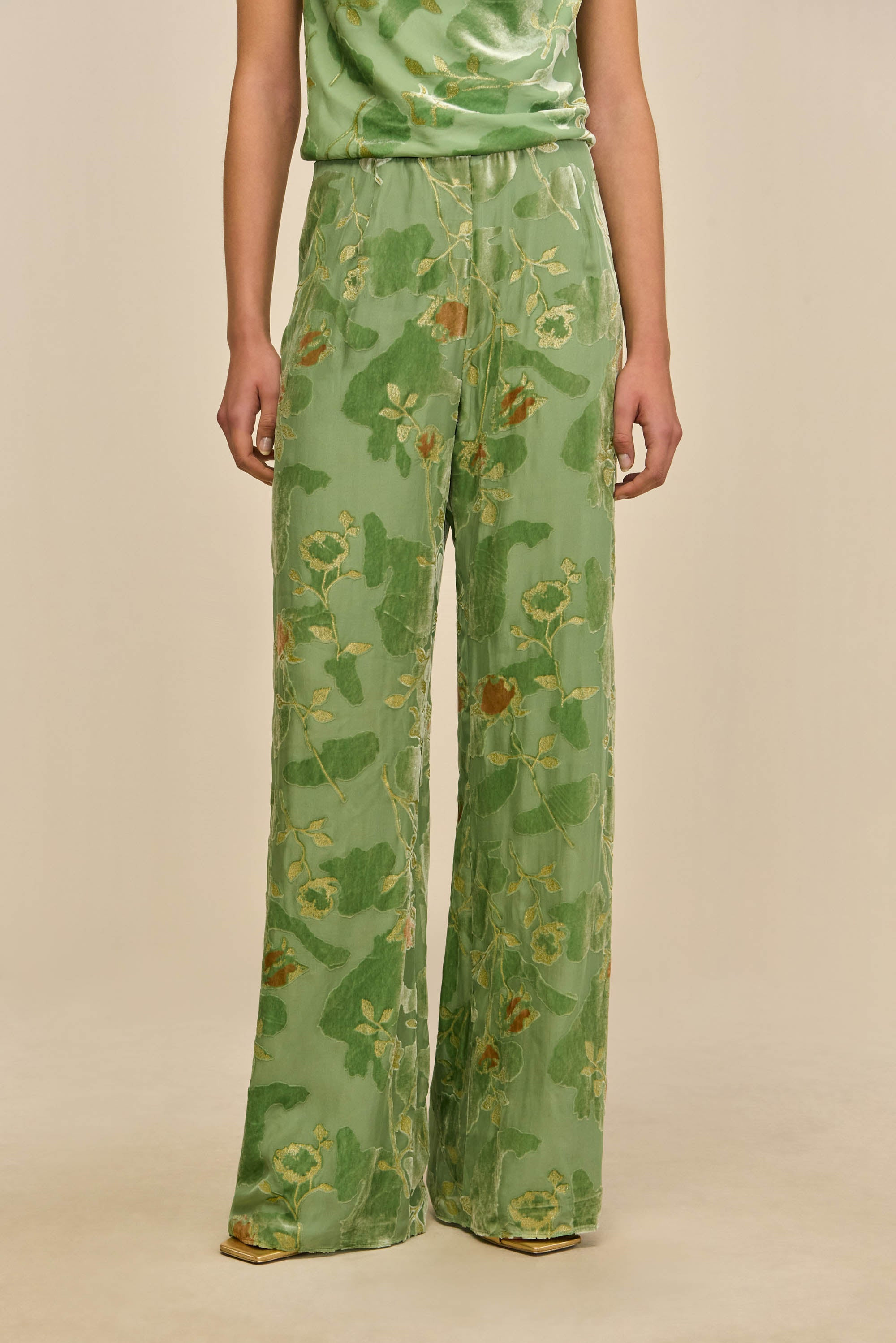 A bias cut sleek silk burnout pant designed to hit at the mid to high waist. — Silk burnout fabric — Mid to high waist — Relaxed fit — Slip on style — Wear with the Augusta Top SIZE & FIT NOTES Model is 5'10" and wearing a size Small COMPOSITION AND CARE 80% VISCOSE 20% SILK Dry Clean Only