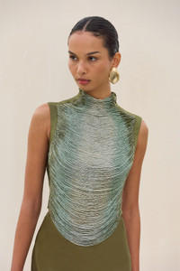 An artisanal top rendered in hand beaded ombre arcs over a mesh underlayer. — Hand beaded — Mesh underlayer — Zippers at both sides of neck — Tonal fabric trim SIZE & FIT NOTES Model is 5'10" and is wearing a size Small Zipper at neckline and side COMPOSITION AND CARE 96% POLYESTER 4% SPANDEX