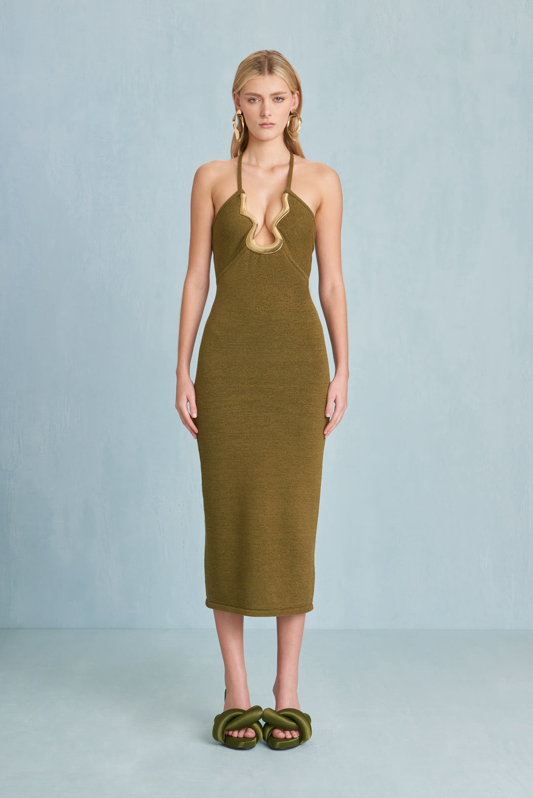 A body-con midi dress made in signature Cult Gaia tape yarn. This specialty hardware is a wearable work of art. This dress features an adjustable interior ribbon to hold the hardware close to the body. — Signature gold toned hardware — Plunging neckline — Midi length SIZE & FIT NOTES Model is 5'11" and is wearing a size Small COMPOSITION AND CARE 77% COTTON 23% POLYESTER