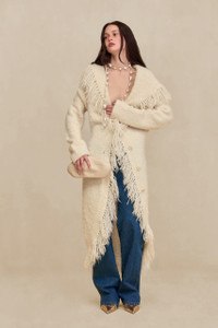A cascading wool alpaca blend duster cardigan with a fringed hem and front button closure. — Wool alpaca blend — Button front closure — Stretch knit — Fringe hem SIZE & FIT NOTES Model is 5'10" and wearing a size Small COMPOSITION AND CARE 39% RWS WOOL, 22% ALPACA, 25% ACRYLIC, 13% RECYCLED NYLON, 1% SPANDEX