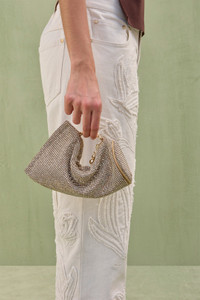 A rhinestone adorned clutch with silver-toned hardware and a zipper closure. — Rhinestone adorned — Silver toned hardware — Zipper & toggle closure — Convertible silhouette SIZE & FIT NOTES 3.54" W x 5.51" H x 9.84" L COMPOSITION AND CARE BODY: 100% COW LEATHER TRIM: 100% PLASTIC LINING: 90% POLYESTER, 10% POLYURETHANE