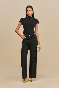 A cropped short sleeve knit top with a flattering mock neckline and curved hem. — Mock neck — Knit viscose material — Curved hem — Cropped length SIZE & FIT NOTES Model is 5'10" and wearing a size Small COMPOSITION AND CARE 65% VISCOSE 35% NYLON