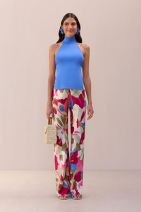 A high-neck, fully open-back halter top with wide back strap and narrow mock neckline. — Fold over mock neck — Open back — Elastic back strap — Lightweight knit