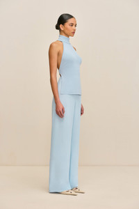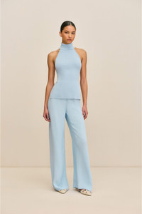 A high-neck, fully open-back halter top with wide back strap and narrow mock neckline. — Fold over mock neck — Open back — Elastic back strap — Lightweight knit SIZE & FIT NOTES Model is 5'10" and wearing a size S COMPOSITION AND CARE 65% VISCOSE 35% NYLON
