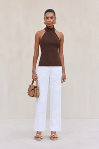 A high-neck, fully open-back halter top with wide back strap and narrow mock neckline. — Fold over mock neck — Open back — Elastic back strap — Lightweight knit