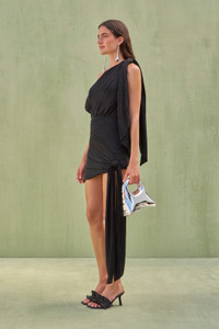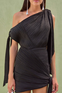 An asymmetrical, artfully draped plisse mini dress with tie details at the shoulders and left hip. — Mini length — Asymmetrical neckline — Plisse fabric — Adjustable tie details at the shoulder and hip