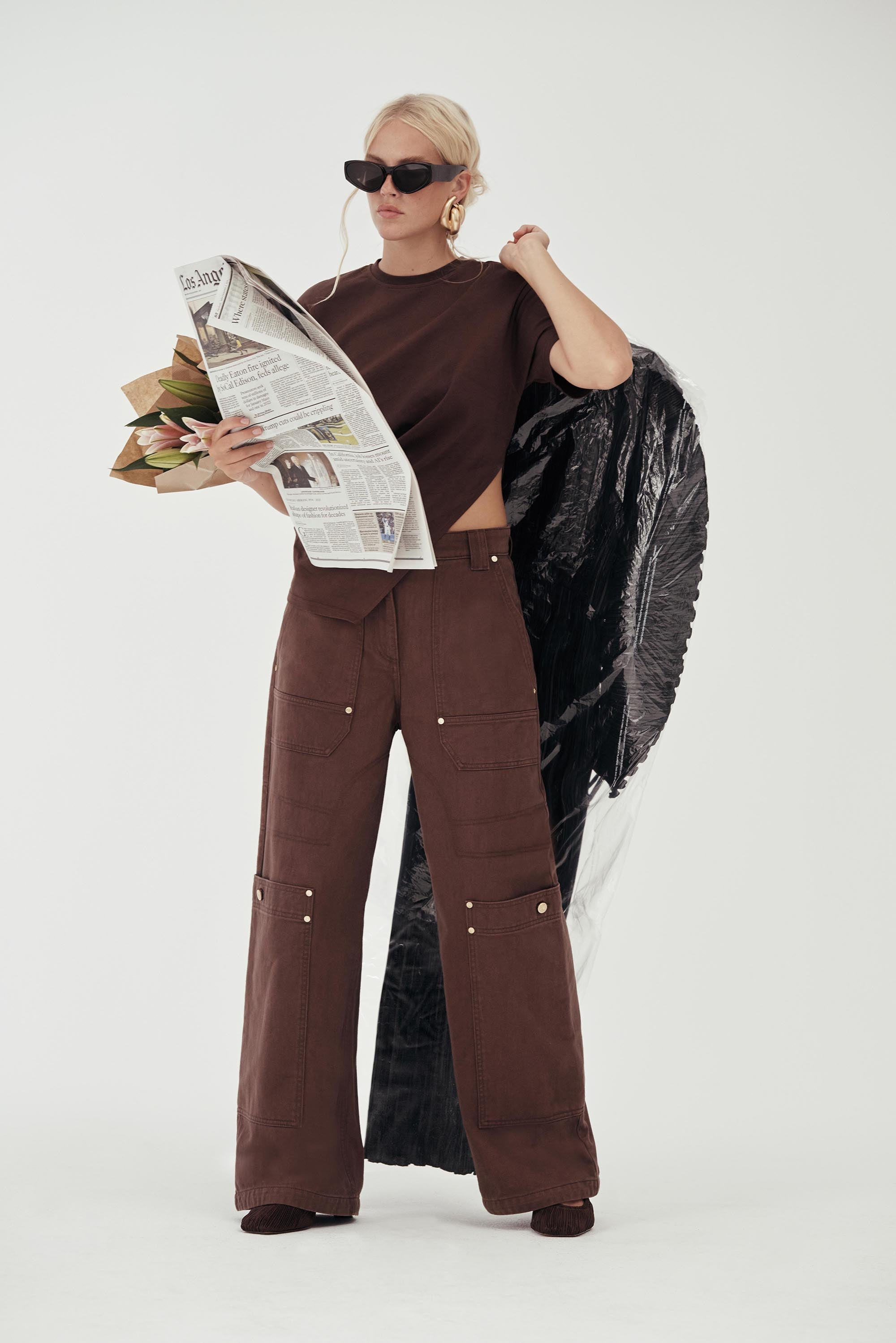 Preorder - Estimated Ship Date is Between October 30th and November 6th Introducing the chocolate brown version of the Cult Gaia classic Wynn cargo pant. — High rise, wide leg fit — Top stitch and stud details — Button front — Functional pockets SIZE & FIT NOTES Model is 5'10" and wearing a size 4 COMPOSITION AND CARE 100% COTTON Machine Wash Cold with Like Colors, Do Not Bleach, Tumble Dry Low or Dry Flat, Iron Medium Temperature, Can Be Dry Cleaned Using Any Solvent Except Trichloroethylene