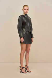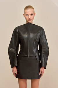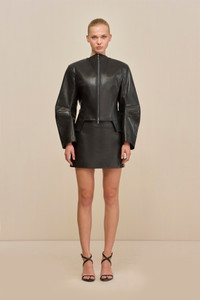 A leather jacket doubling as a sculptural objet d'art, featuring a unique collar designed with two magnets that close to create a mock neck silhouette. — Genuine leather — Mock neck detail — Magnet closure at collar — Exposed front zipper SIZE & FIT NOTES Model is 5'10" and wearing a size Small COMPOSITION AND CARE 100% LAMB LEATHER