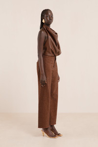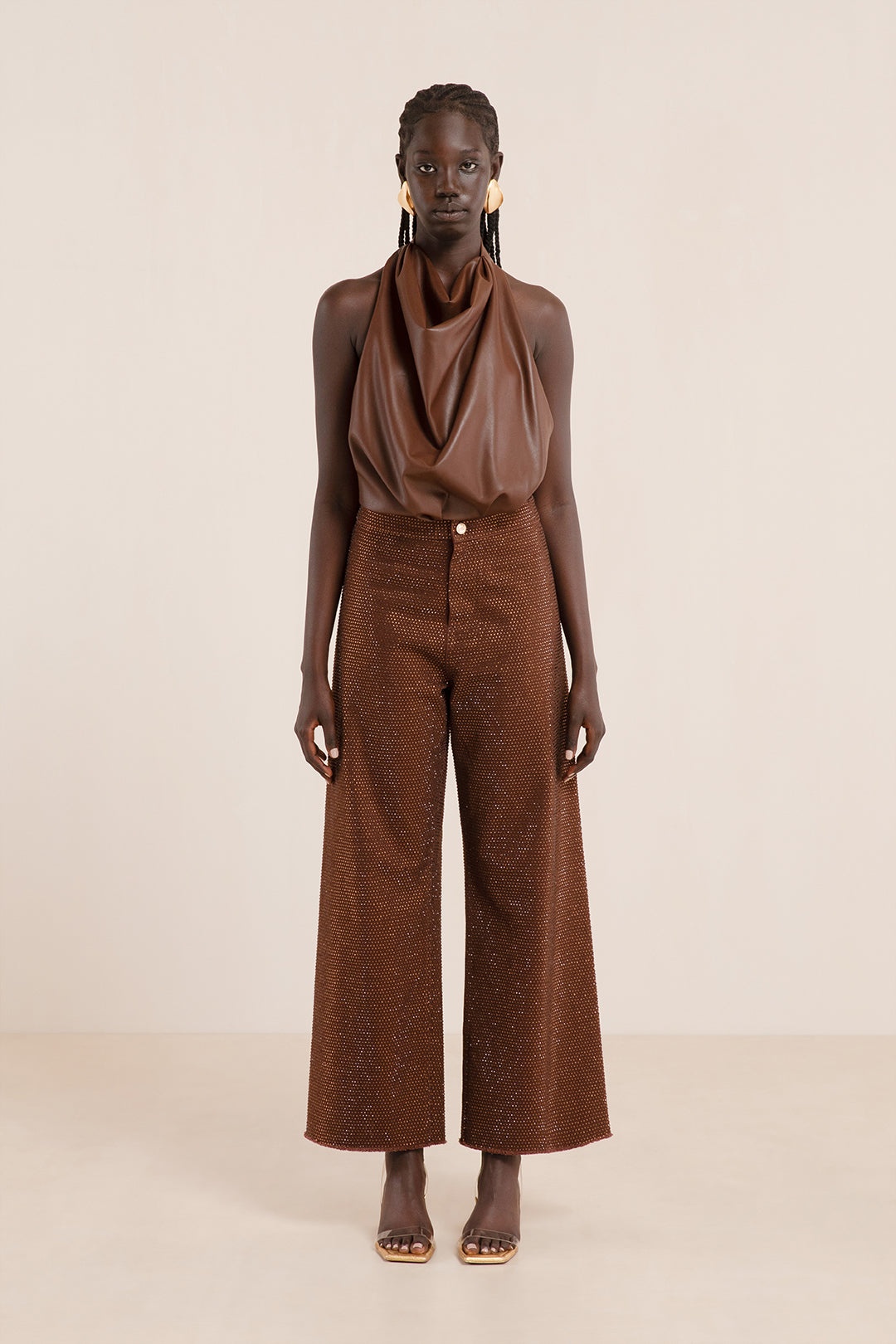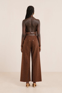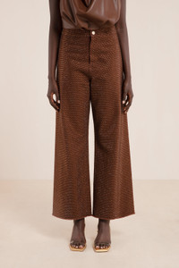 Preorder - Estimated Ship Date Between January 1st and January 20th A high waisted stretch denim pant adorned in all-over tonal rhinestones with a zip fly and back pockets. — High rise — Flared leg — Cut-off hem — Back pockets