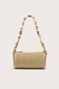 Preorder - Estimated Ship Date is Between October 17th and October 24th A vacation-ready raffia shoulder bag featuring a strap adorned with faux stones. — Raffia — Faux stones on strap — Gold-toned hardware — Zipper closure SIZE & FIT NOTES 3.35" W x 6.30" H x 8.27" L COMPOSITION AND CARE 100% POLYETHYLENE; LINING: 100% COTTON; TRIM: 100% COW LEATHER, 100% FAUX RESIN STONES; HW: ZINC ALLOY