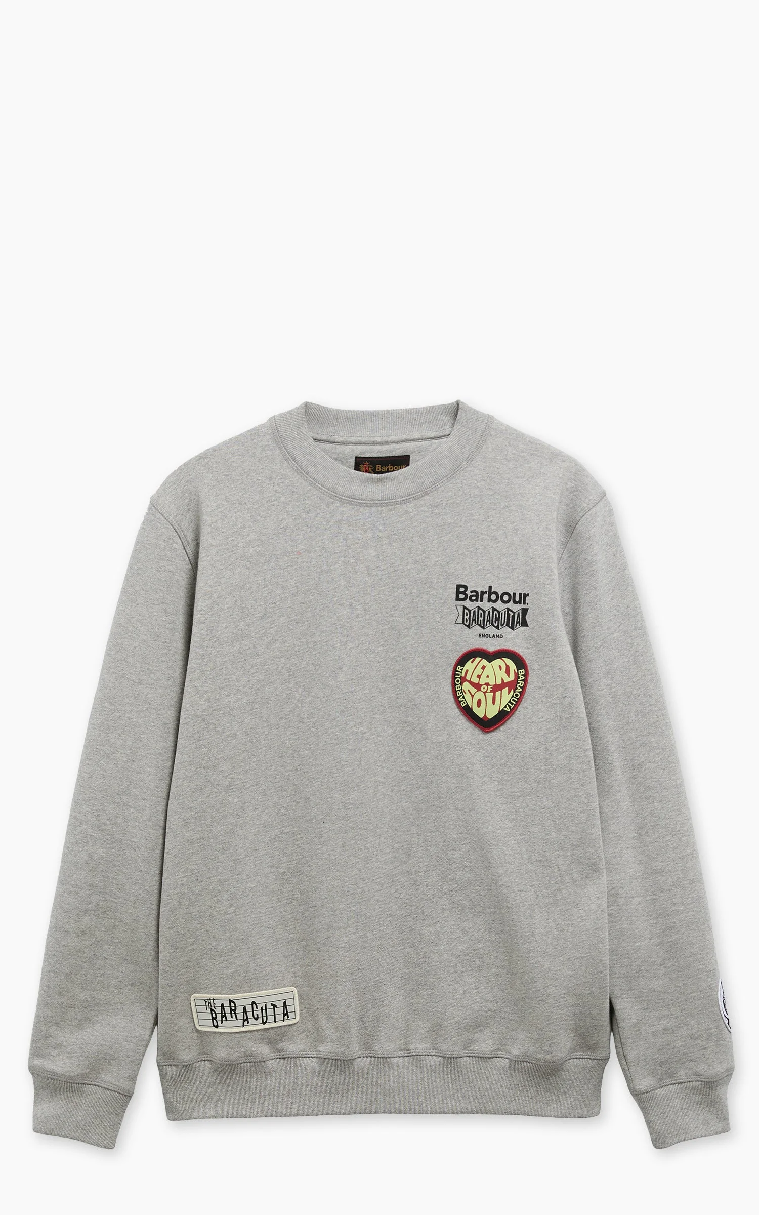 In a seamless synergy of the two brands, the Barbour x Baracuta collaboration unites iconic Baracuta silhouettes with Barbour’s deep-rooted heritage, blending timeless British style and classic functionality. The Barbour x Baracuta Northern Sweatshirt reimagines the classic crew-neck silhouette with a bold contemporary edge. Crafted from 100% cotton American open-end fleece, the design features multiple Northern Soul and dual Barbour x Baracuta branded patches across the chest, hem, and sleeves, delivering a refined and elevated take on casual style. - Style: Sweatshirt Northern - Fit: Regular fit - Color: Grey marl - Material: 100% cotton - Barbour x Baracuta collaboration - Made in EU Model is 183cm - wears size M
