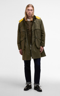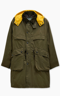 Oversized dry wax finished coat with a detachable contrast wool hood. This style features bellow pockets, side vents, drill cotton lining and inner studs for interactivity. - Style: Bedale Field Coat - Fit: Loose fit - Color: Khaki Brown - Material: 100% cotton - Lining: 100% cotton - Barbour x Kaptain Sunshine collaboration - Dry wax finish - Detachable contrast wool hood - Bellow pockets - Side vents - Drill cotton lining - Inner studs for interactivity Model is 183cm - wears size 36/M
