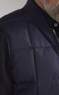 The VEST1 is a nylon down gilet. This slim-fit gilet features a brass-coloured TALON zipper. On the back, the iconic orange Fortela stitching embodies the philosophy of the brand that creates each garment to last and age with its wearer, bringing with it a piece of history reworked in line with the inspiration and dedication of Alessandro Squarzi. - Style: Vest1 - Fit: Slim fit - Color: Blue - Material: 100% polyester - Goose down padding - Nylon vest - Talon central zip in brass - Two central pockets Our model is 190cm, 95kg - wears size 50/L