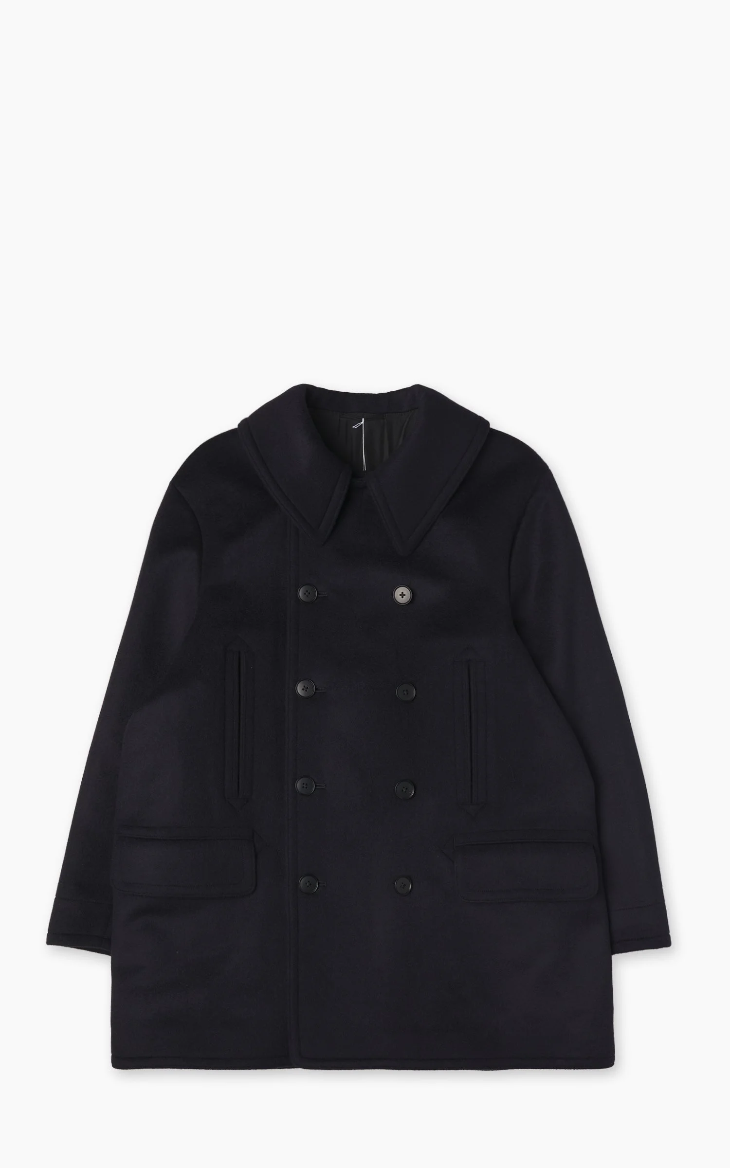 This luxurious cashmere-wool melton fabric by Kaptain Sunshine is crafted through a dense double-weave of Inner Mongolian cashmere and high-quality Super 160’s wool. The result is a material that offers exceptional warmth, refined texture, and a beautifully soft touch. - Style: Pea Coat - Fit: Loose fit - Color: Navy - Material: 50% cashmere, 50% wool - Lining: 100% silk - Made of cashmere/wool mix - Double-woven blend of high-density cashmere from Inner Mongolia - High-quality Super 160's wool - 4 front pockets - Button placket - Made in Japan Our model is 187cm, 85kg – wears size 3/L