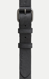 Belt made from vegetable-tanned full-grain leather that will age beautifully with use. Two loops keep the belt end neatly in place and where the pin meets the buckle we have wrapped the buckle in leather, simply because it looks good. Metal belt buckle and Nudie Jeans debossed logo. - Style: Dwayne Leather Belt - Color: Black - Material: Leather - Vegetable tanned leather - Metal buckle - Width: 2,8 cm - Adjustable loops - Made in EU Sizes are measured from midhole to buckle!
