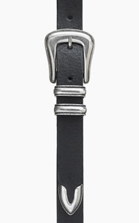 Classic western-style belt made from vegetable-tanned full-grain leather. - Style: Western Silver Belt - Color: Black - Material: Leather - Vegetable-tanned full-grain leather - Antique buckle - Width: 2,4 cm - Adjustable loops - Made in EU Sizes are measured from midhole to buckle pin!