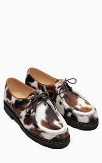 A true icon in the Paraboot collection, the Michael "Cow Hair" stands out with its bold character and timeless design. Crafted from genuine cowhide with natural hair, each pair is completely unique - no two are alike. The natural patterns and markings on the hide ensure every shoe tells its own story. Handmade in France using traditional techniques, the Michael features a Norwegian welt construction for exceptional durability and weather resistance. The signature rubber sole delivers all-day comfort, making it as practical as it is distinctive. Whether you're a collector or looking to make a statement, the Michael Cow Hair is a rare piece of footwear craftsmanship that fuses heritage with individuality. - Style: Michael - Color: Brown, White - Material: 100% calfskin (cow hair) - Piped seam Derby - 2 eyelets - Leather lined model - Genuine Norwegian welted - Genuine rubber sole - Made in France