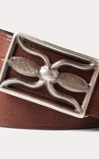 Made in Italy from vegetable-tanned leather that is hand-dyed and burnished. Custom brass buckle with a corroded silver finish. Corroded silver-finished brass snaps at the interior. - Style: Hawkins Belt - Color: Vintage Brown - Material: 100% leather - Made of cow leather - 4cm wide - Single-prong brass buckle with a corroded silver finish - Single leather keeper - Slightly pointed tip - Made in Italy