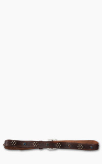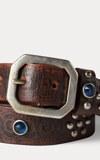 Distressed leather belt. Embossed with a Southwestern-inspired pattern. Embellished with specially corroded brass studs and glass stones. Custom buckle. - Style: Rasco - Color: Vintage Black - Material: 100% leather - Made of cow leather - Vegetable-tanned Italian leather - Width: 1.25" (approx. 3,1cm) - Single-prong brass buckle - Embossed with a Southwestern-inspired pattern - Embellished with specially corroded brass studs and glass stones - Made in Italy