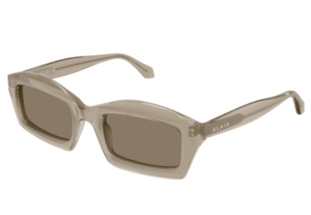 ALAIA AA0089S-003 Rectangular shape belonging to Bombe concept, which features rounded surfaces and volumes. Alaia's lettering logo is lasered and beautified by enamel on thin temples to provide Brand recognizability. Alaia's classic black is paired with new nuances of grey, brown and havanas. Composition: Acetate Color: Brown Size: 53mm 22mm 145mm