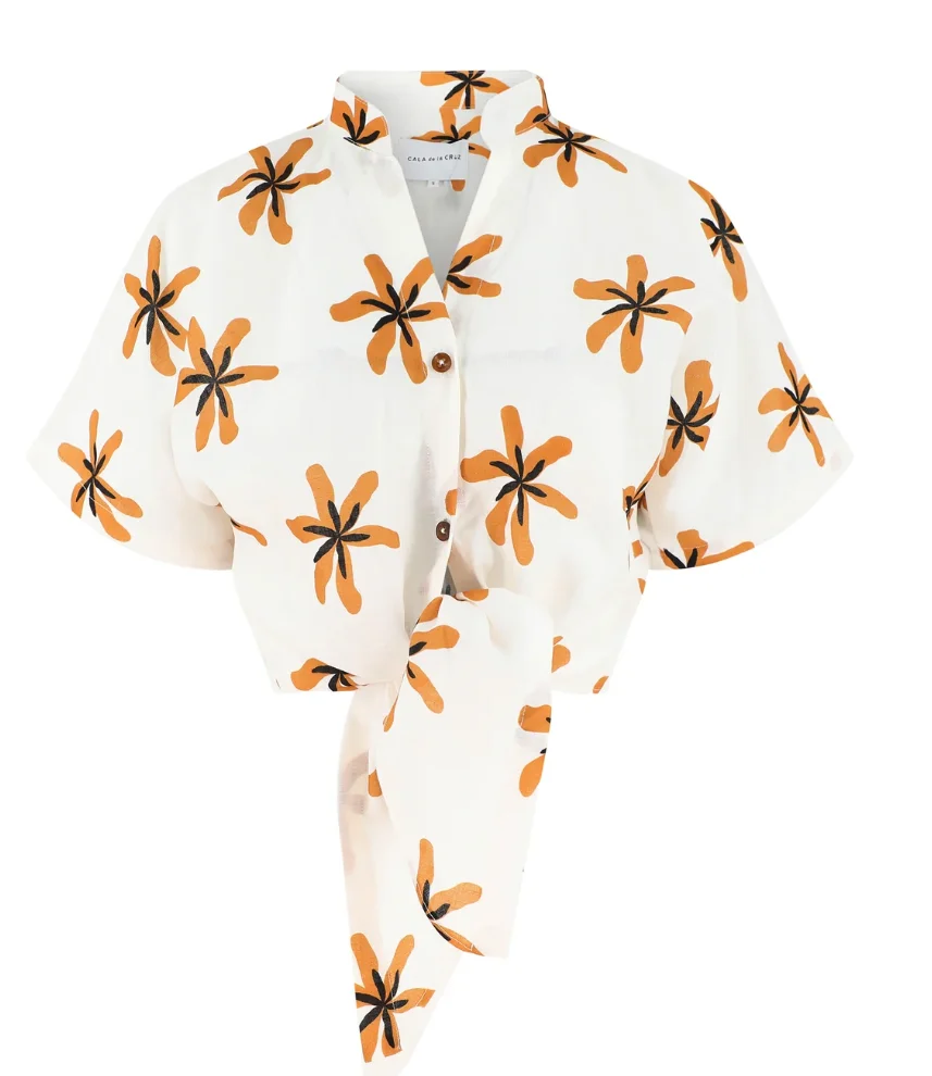 CALA DE LA CRUZ Leroy Top Short sleeve button down shirt with front tie. Made from 100% linen. Composition: 100% Linen Color: Cattleyaivory Size: True to Size