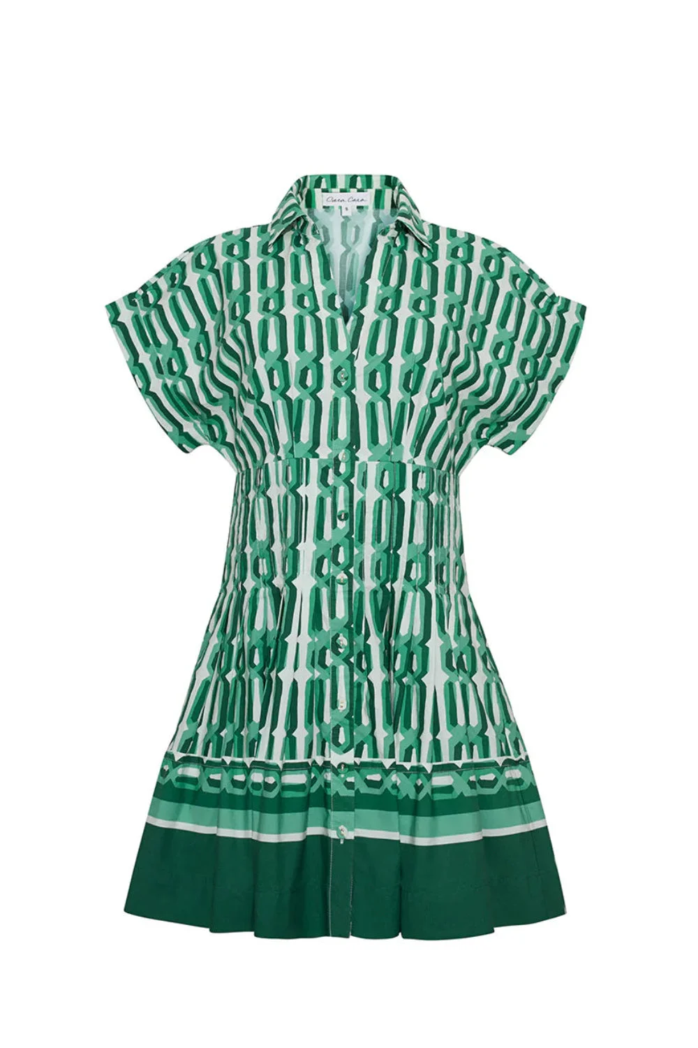 CARA CARA Nash Mini Dress Mini length shirtdress designed for fit-and-flare look, Center front placket opening is functional, Functional side seam pockets, Stitching detail at skirt yoke and bottom hem, Bust and back bodice have pin tucks for slight shaping, Sleeve hem has double rolled cuff, Unlined, Hem features a decorative band detail lip, Placed print. Composition: 100% Cotton Poplin Color: Martin Geo Fit: True to Size