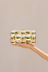 CULT GAIA Darcy Clutch A rectangular plated ABS clutch with a removable strap with sculptural "woven" detailing. Plated ABS, Top closure, Removable strap, 3D "woven" details Composition: 100% Acrylic Color: Shiny Gold Size: 70mm W x 110mm H x 210mm L