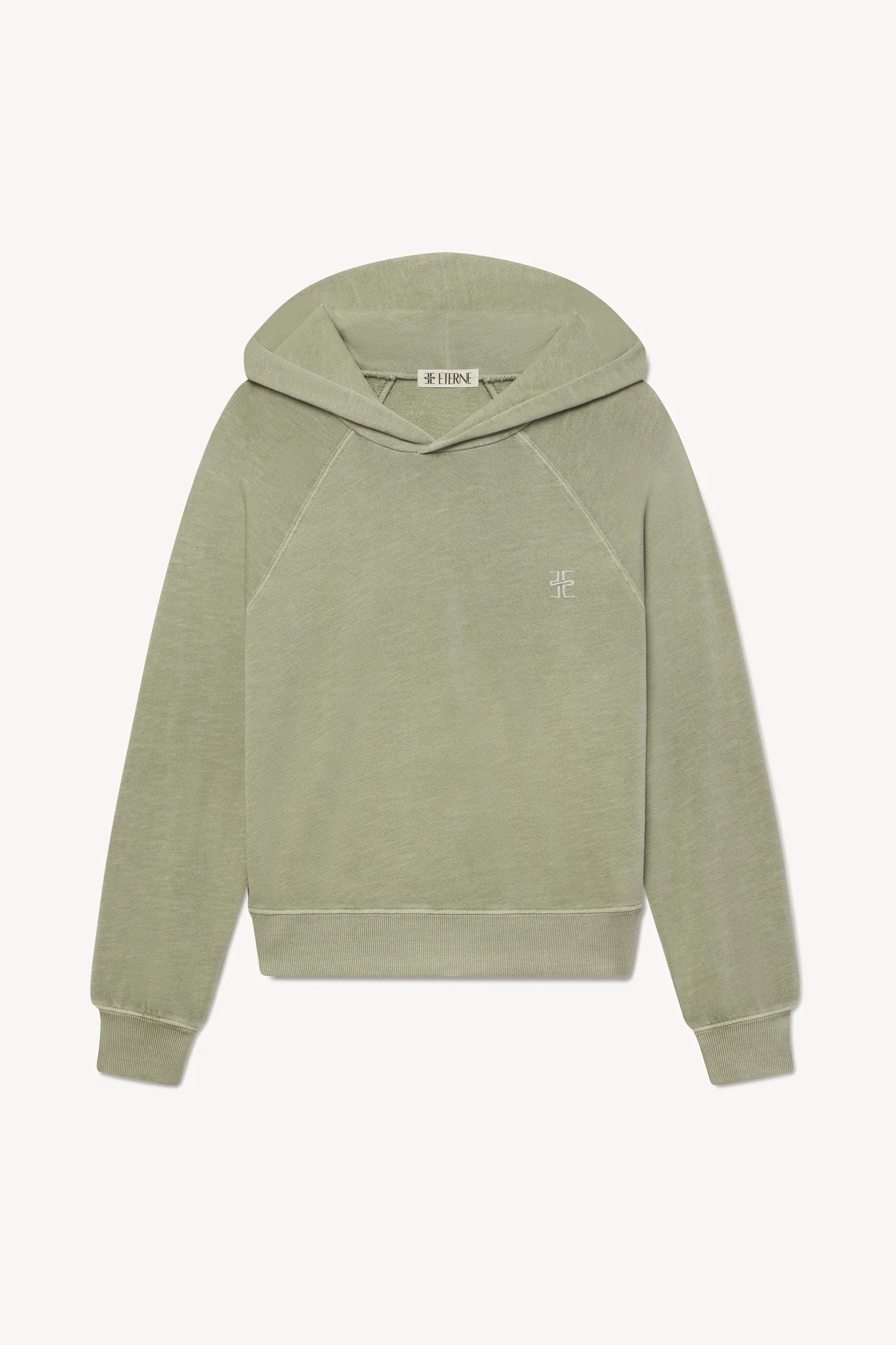 ETERNE Shrunken Hoodie Sweatshirt Sage ETERNE's Shrunken Hoodie Sweatshirt is crafted from our lightweight French terry, offering a relaxed fit and a regular length—a versatile essential for everyday wear. Composition: 100% Cotton Color: Sage Fit: True to Size