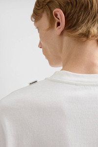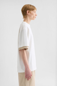 JIL SANDER Cotton Crew-Neck T-Shirt Oversized fit and boxy shape, dropped shoulders, single t-shirt with double-layer effect, Jil Sander logo tag on shoulder, striped cotton undersleeves, lightweight compact cotton jersey. Made in Italy Composition: 100% Cotton Color: White Fit: Boxy, Oversized Fit