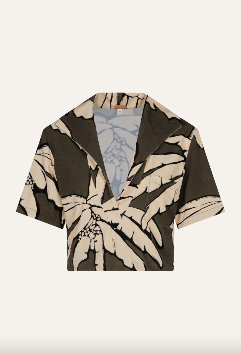 JOHANNA ORTIZ Palms Misty Hem T-Shirt This short-sleeved terry top in a green and ecru palm print offers a relaxed and versatile fit with a slip-on closure. Its soft texture and bold pattern make it ideal for layering over swimwear or pairing with matching pieces for a coordinated look. Composition: 85% Polyamide, 15% Elastane Color: Green/Ecru Fit: Slim Fit, for a more relaxed fit size up