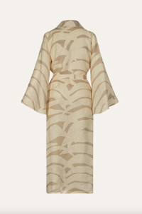 JOHANNA ORTIZ Sail Softy Kimono in Swim Palm Stripes A lightweight linen kimono featuring a tonal palm stripe pattern in sand and ecru. With a front tie closure and wide sleeves, this versatile piece offers effortless layering, perfect for beachside lounging or adding a stylish cover-up to your summer wardrobe. Designed for a relaxed fit, offering a comfortable and laid-back style. Composition: 100% Linen Color: Sand/Ecru Fit: Relaxed Fit