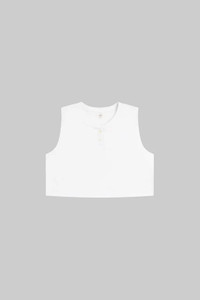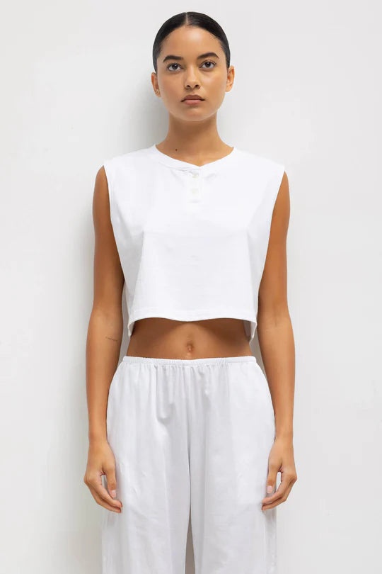 LESET Margo Sleeveless Henley White Our no. 1 bestseller The Margo, reimagined with a fresh cropped length and henley neck. With its signature boxy yet tailored fit, The Margo Sleeveless Henley is a foundational dressing staple. Composition: 100% Cotton Color: White Fit: True to Size