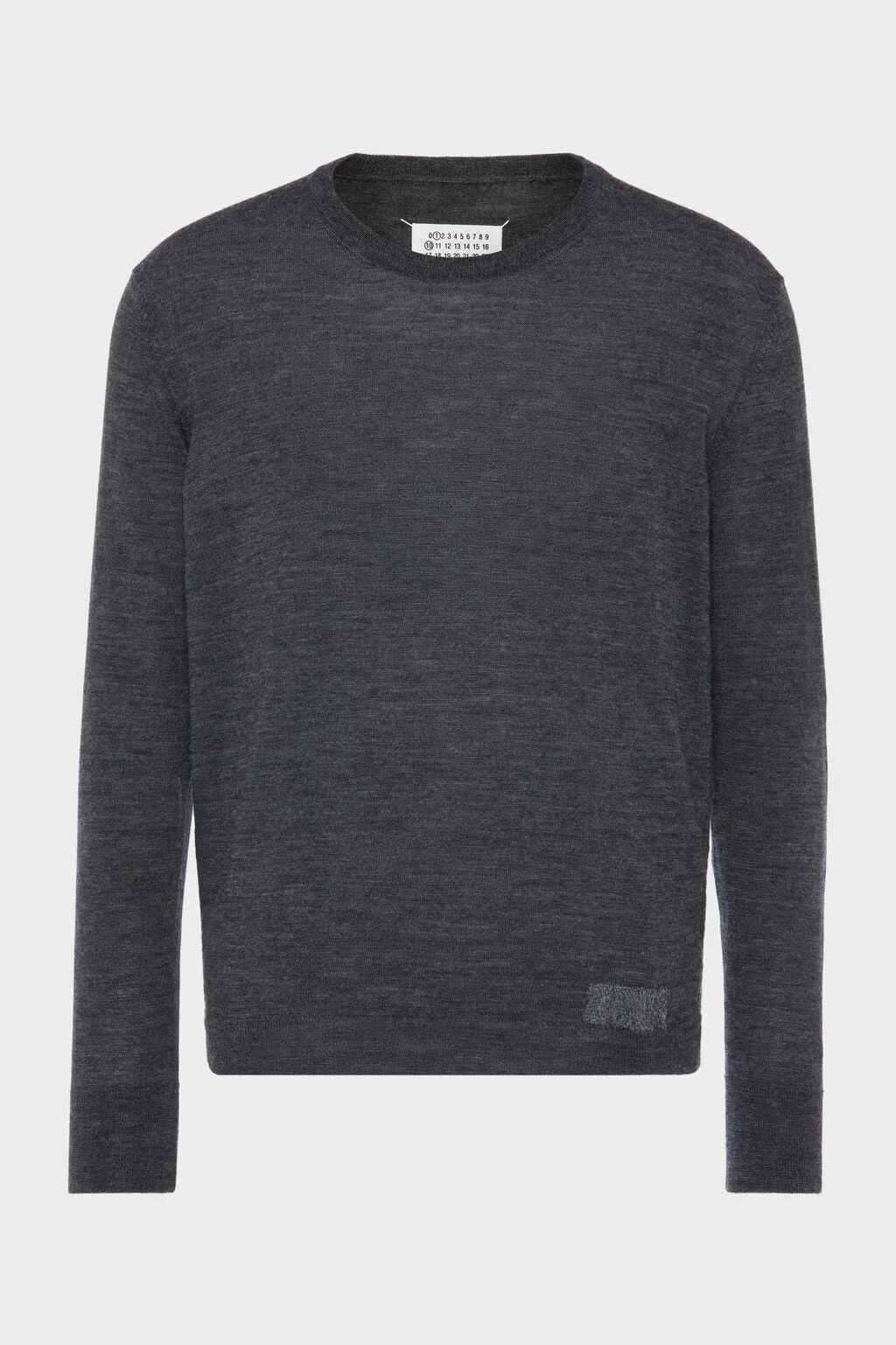 MAISON MARGIELA Wool Blend patch Sweater A fine wool blend sweater that reveals a subtle play of tones across its surface. The piece is finished with a single patch of visible mending at the hem, introducing a quietly subversive detail to its otherwise classic form. At the back, the Maison’s signature four stitches appear; the opposite of a label. Composition: 80% Wool 20% Polyamide-Nylon, Gauge 14 lightweight knitted Color: Grey Fit: True to Size
