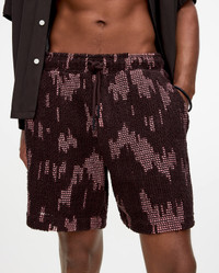 OAS Brink Crochet Shorts The Brink crochet shorts presents a composition of dynamic contrasts with its two-toned jacquard pattern. Shaped to a mid-rise fit with multiple pockets and an elasticized waistband. Wear them with flip-flops or heels depending on your mood. Composition: 90% Cotton, 10% Polyester Color: Brink Fit: True to Size