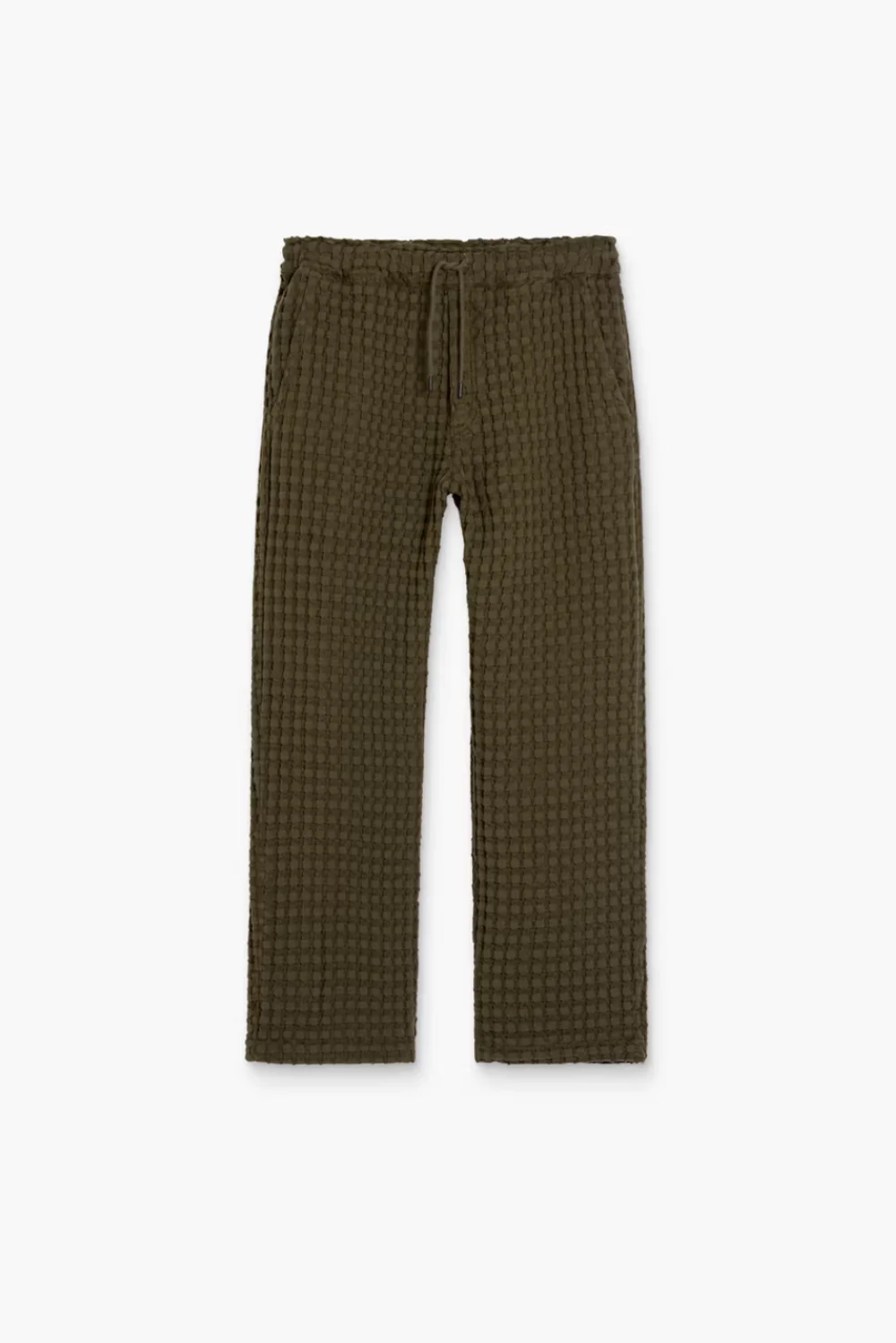 OAS Turtle Ayora Waffle Pants The Turtle Ayora waffle pants are woven with generous amounts of cotton to a waffle texture that feels particularly soft and breezy against skin. Shaped to a mid-rise fit that sits just below the waist, with multiple pockets and an elasticized drawstring waistband ensuring both practicality and a tailored finish. Heavyweight waffle-weave, Breathable, Elastic waist, Two slanted side pockets and one back patch pocket, Made in Portugal, Designed in Stockholm. Composition: 100% Cotton Color: Green Fit: Regular Fit, Mid-rise, True to size