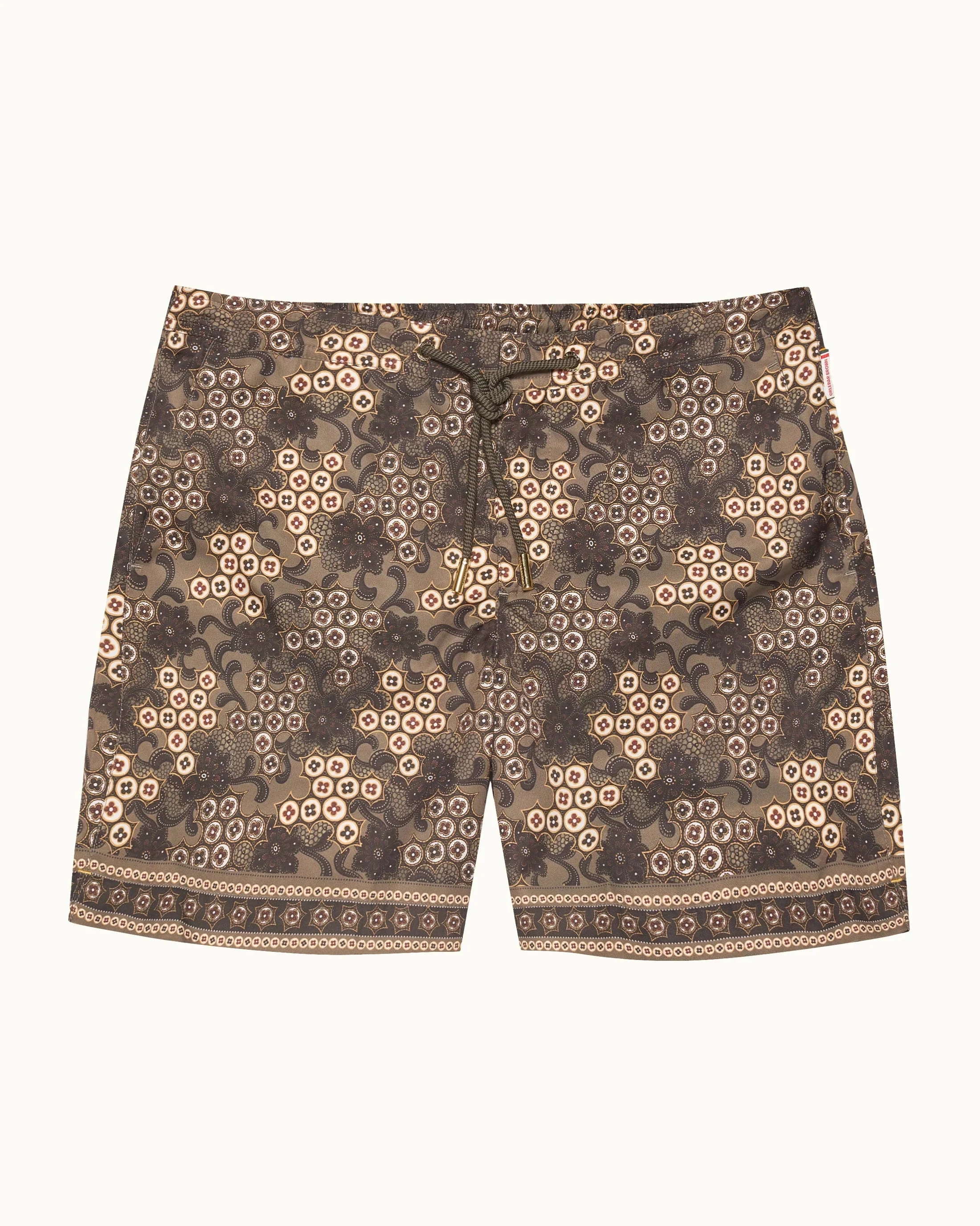 ORLEBAR BROWN Bulldog Drawcord Paisley Bloom Swimsuit The edge crumbles slightly beneath your toes, bits of limestone breaking loose and tumbling into the water far below. Sunlight filters through the canopy, splintering across the surface, turning the pool into something electric - deep, endless, waiting. A breath in. A push forward. The Bulldog was made for moments like this. Quick-drying, light enough to move with you, the rope-style drawcord cinching in just enough before the plunge. No weight, no drag, no second thoughts. Just the clean arc of a dive, the rush of cool water closing over, the moment where time holds still before letting you go. Life’s short. The surface shatters. A whoop echoes off the stone. Some leaps take you further than expected." Feel Summer. Composition: 100% polyester Color: Bronze Fit: If in-between sizes, choose a size up