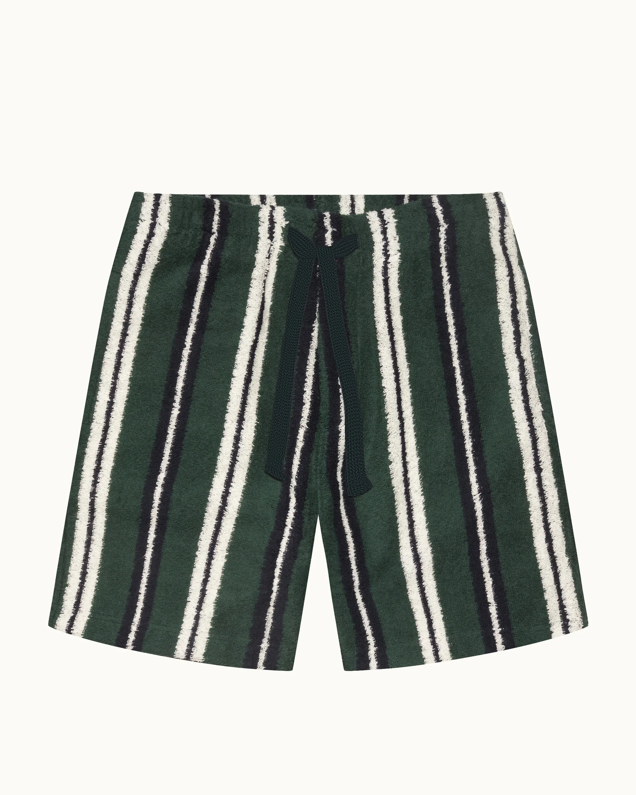 ORLEBAR BROWN Trevone Towelling Stripe Short Designed for long lunches, longer naps, and languid days adrift somewhere between Sicily and the Cyclades. Trevone is your go-to for barefoot ease and boat-side swagger - a classic fit short in double-faced towelling pique, knitted in Portugal from 100% cotton so plush it practically purrs. There’s a drawcord waist for when the skipper pulls out the mezze, and side-entry pockets for hands, sunglasses, or the occasional Greek olive. The texture is pure Riviera nostalgia - think 1960s film stars, striped parasols, and an indifference to time zones. Wear them after a dip. Wear them with nothing but salt in your hair and a wicked grin. Or pair them with a crisp white shirt and pretend you know how to sail. Trevone doesn’t care if you make it to port. It just wants the wind in your hair, the sun on your thighs, and a reason to open another bottle. Composition: Double-faced towelling pique, knitted in Portugal (100% cotton) Color: Tarragon Stripe Size: Model’s height: 6'2" and wears size M.