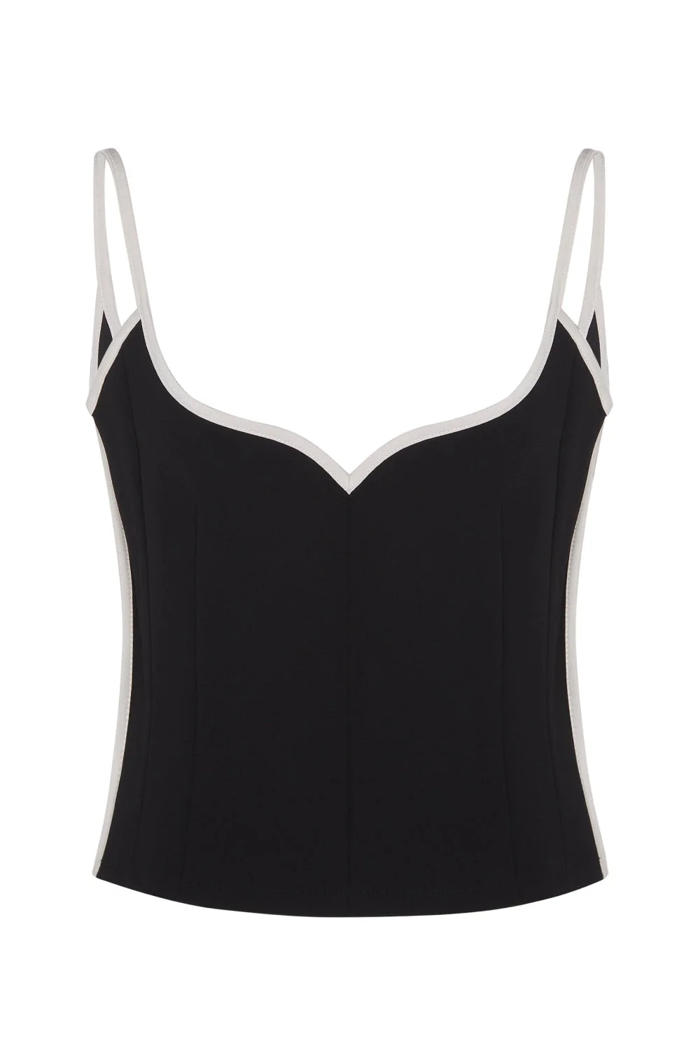 PARIS GEORGIA Heart Singlet Our Heart Singlet in Black is made from a recycled bonded fabric that has a slight stretch. This best-selling top has a sculpted heart neckline top with contrast white binding. It is a fitted style designed to flatter the female form. Composition: Japanese Bonded Stretch 63% Triacetate 37% Polyester Color: Black/ White Size: True to Size